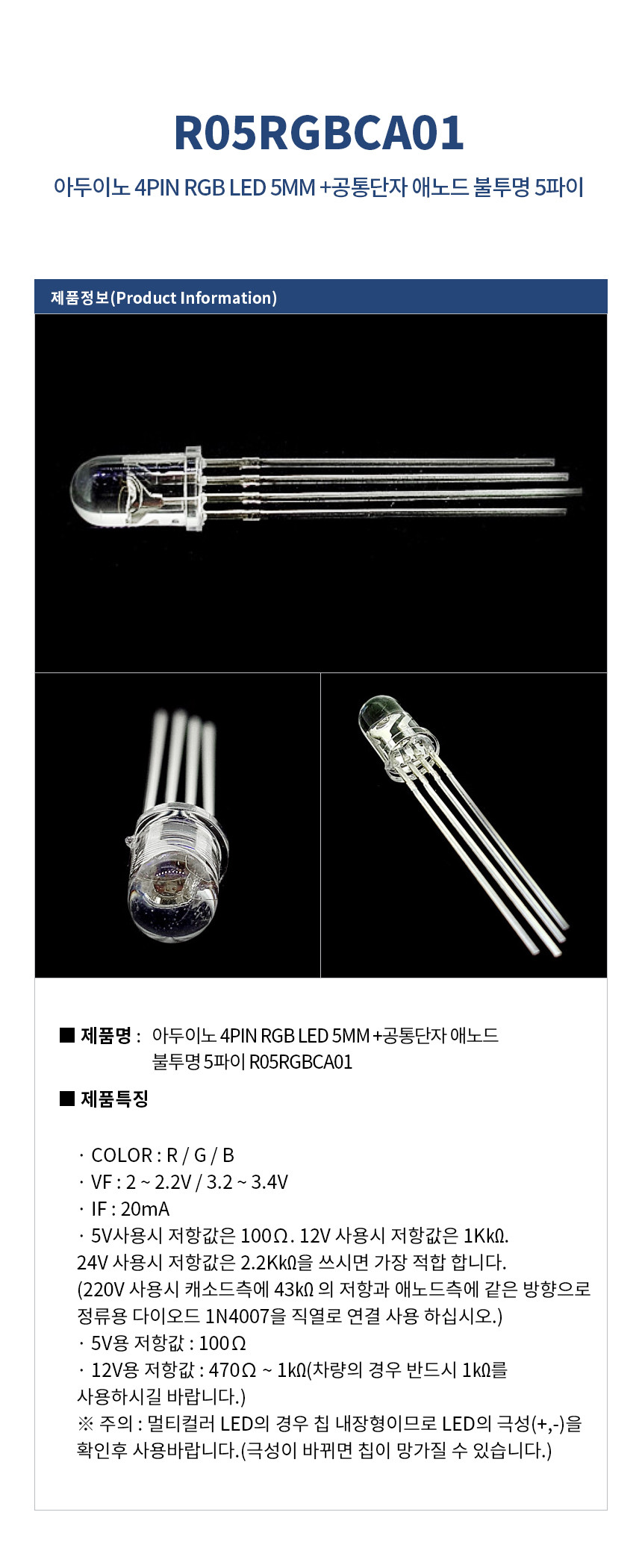 아두이노 4PIN RGB LED 5MM +공통단자 애노드 5파이 R05RGBCA01