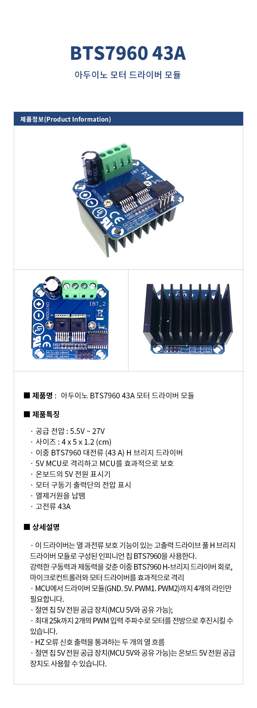 아두이노 BTS7960 43A 모터 드라이버 모듈 BTS7960 Dual H-Bridge Motor Controller Module