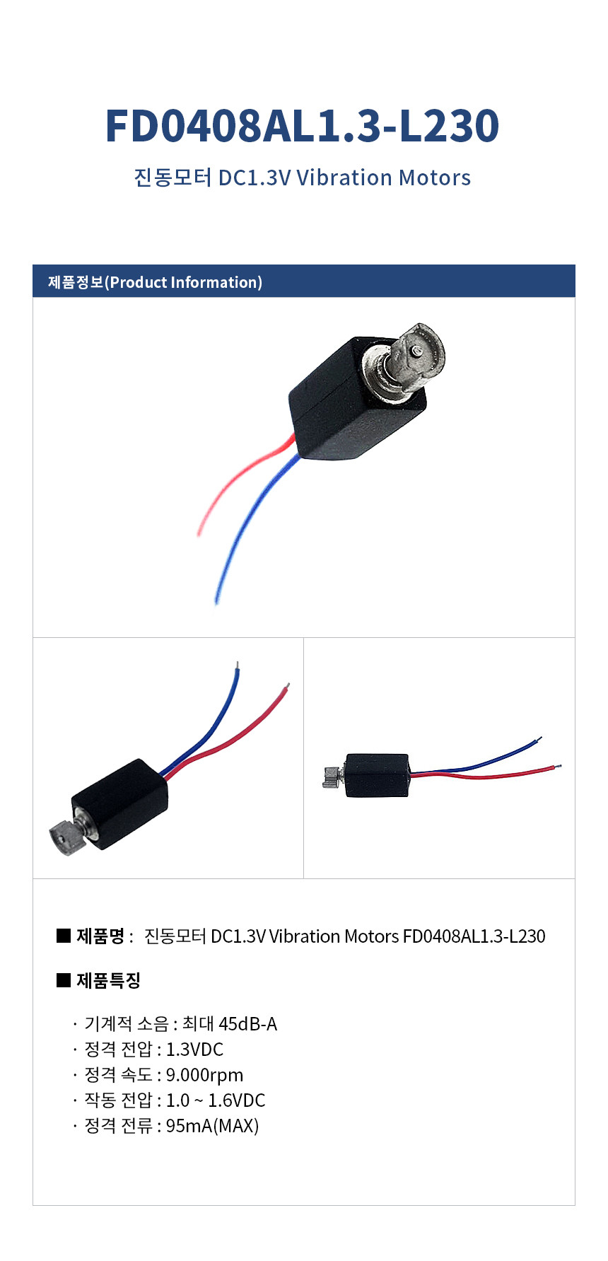 진동모터 DC1.3V Vibration Motors 1.3VDC MOTOR FD0408AL1.3-L230