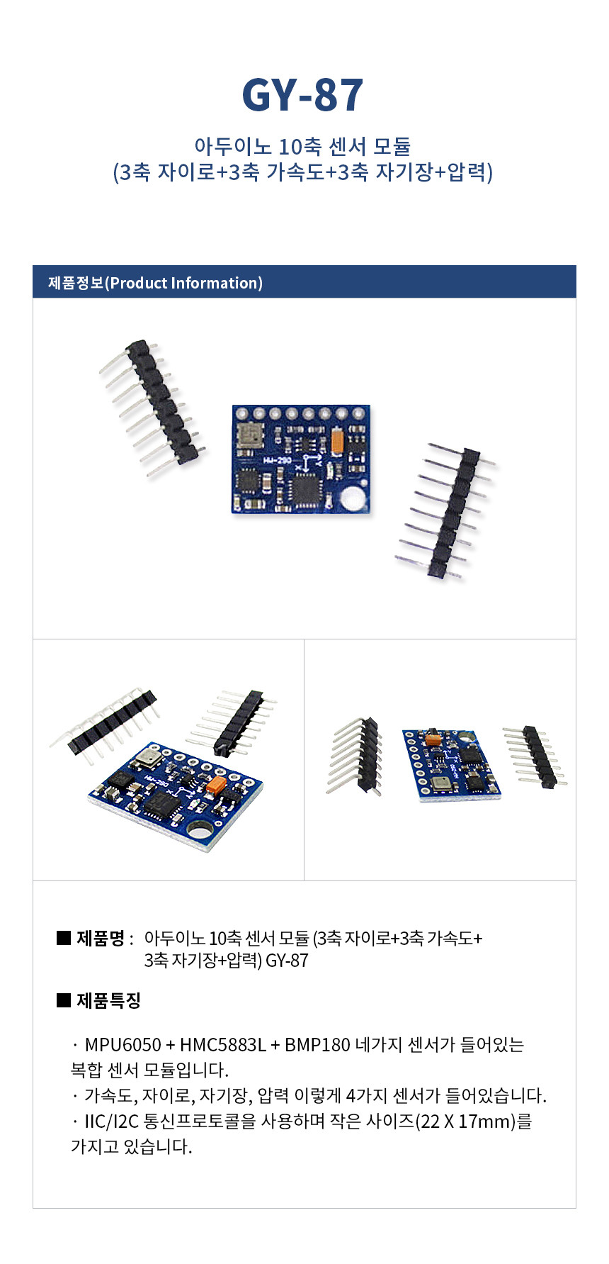 아두이노 10축 센서 모듈 (3축 자이로+3축 가속도+3축 자기장+압력) GY-87